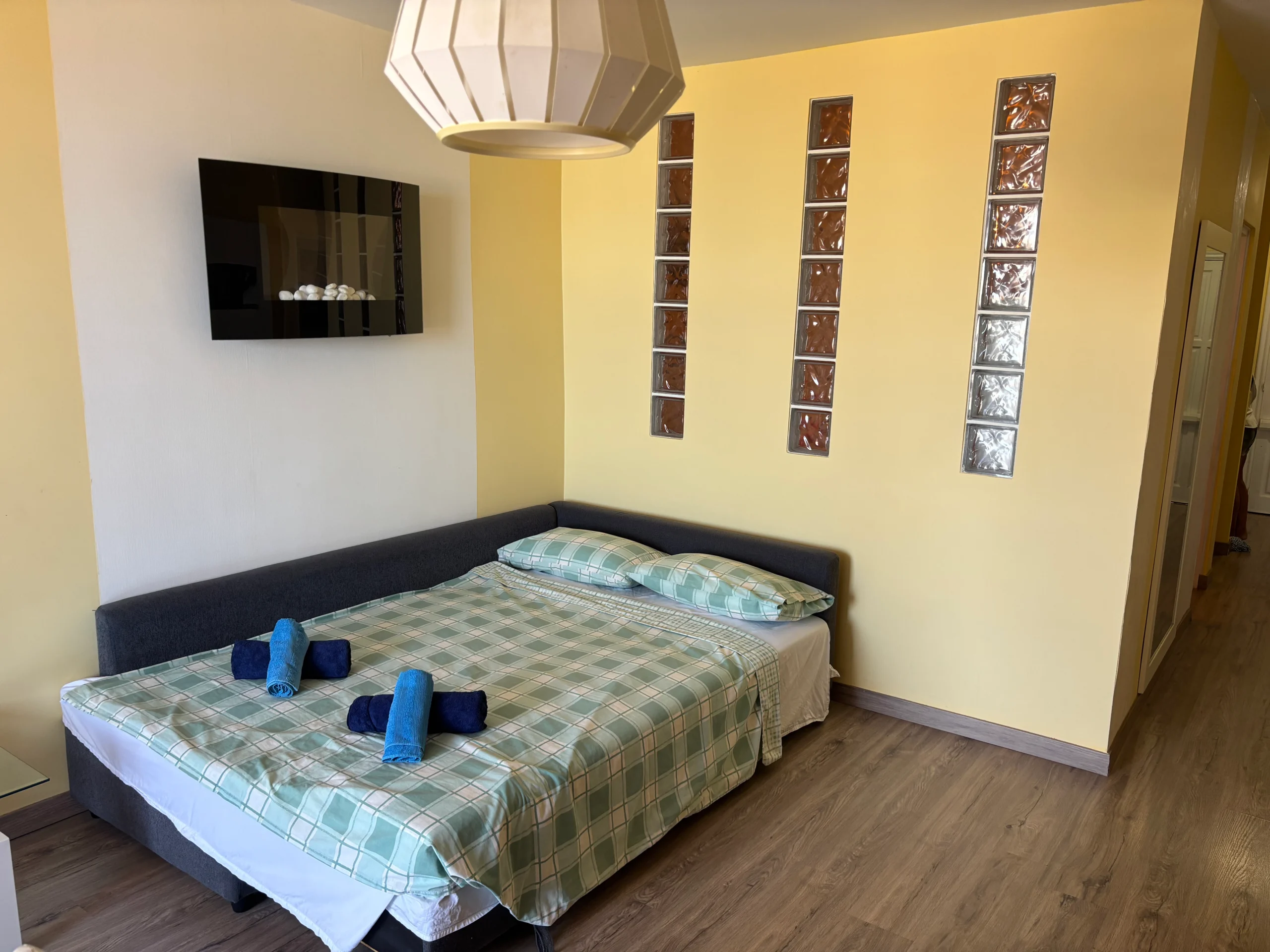 - Ágyak: 1 franciaágy, 1 kihúzható kanapé