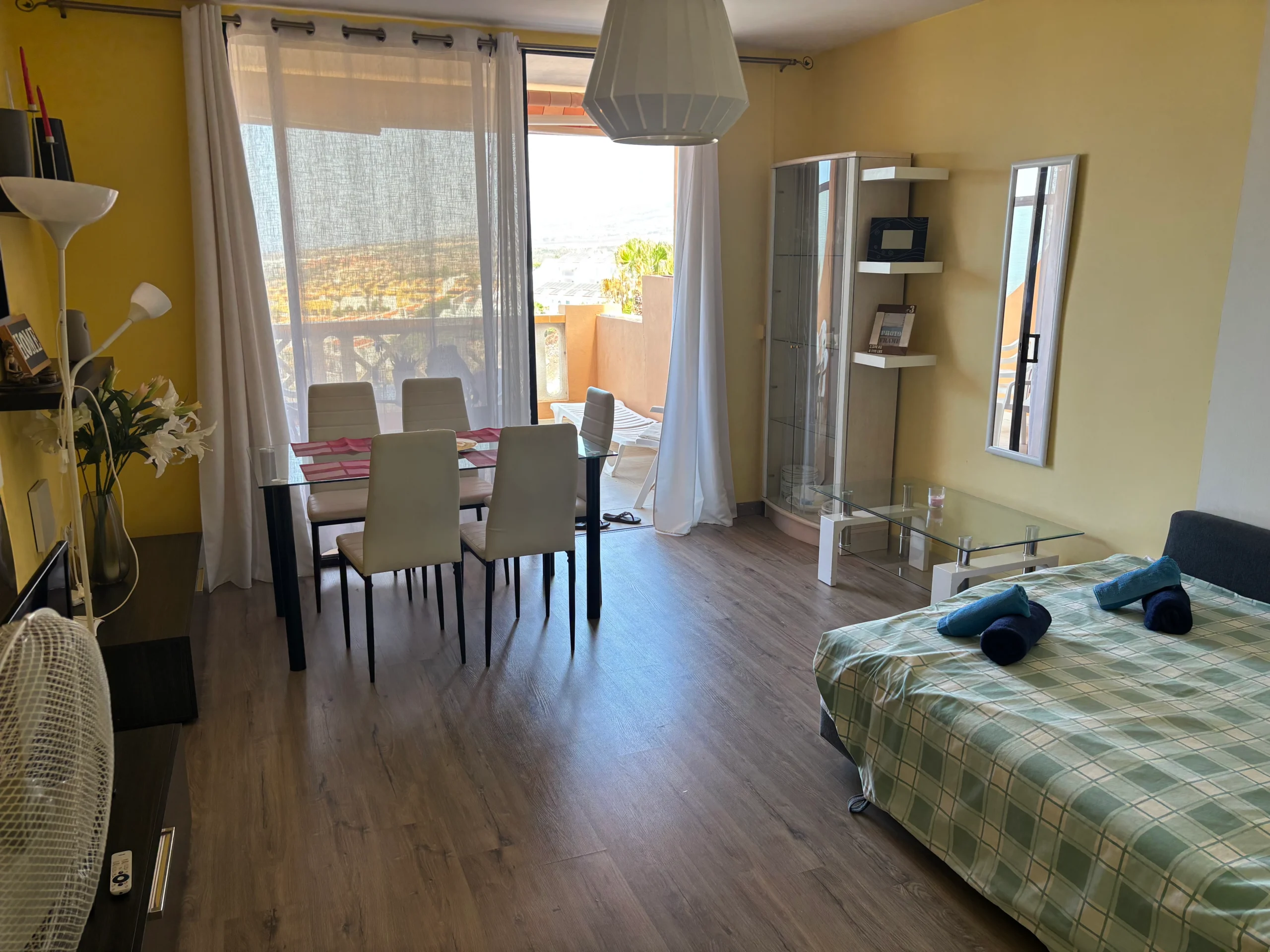 A teraszról a szállás jó elhelyezkedésének köszönhetően látható egy másik látványosság, az Aqualand Costa Adeje is.