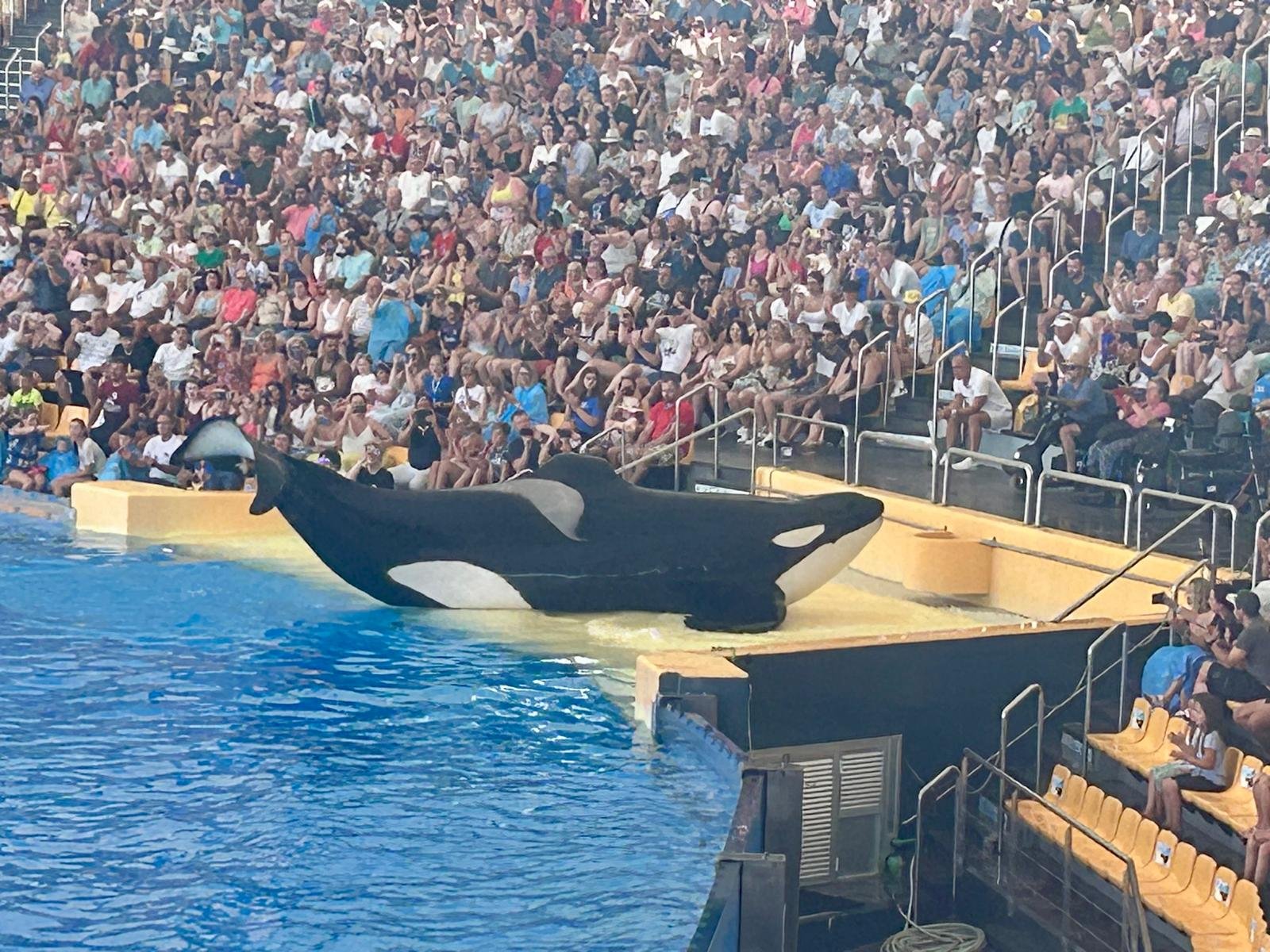 - Az orca bemutatónál különösen hasznos, ha magasabban ülsz, mert a show részeként az orcák gyakran csapnak vizet a lelátó irányába – így elkerülheted a fröccsenést.